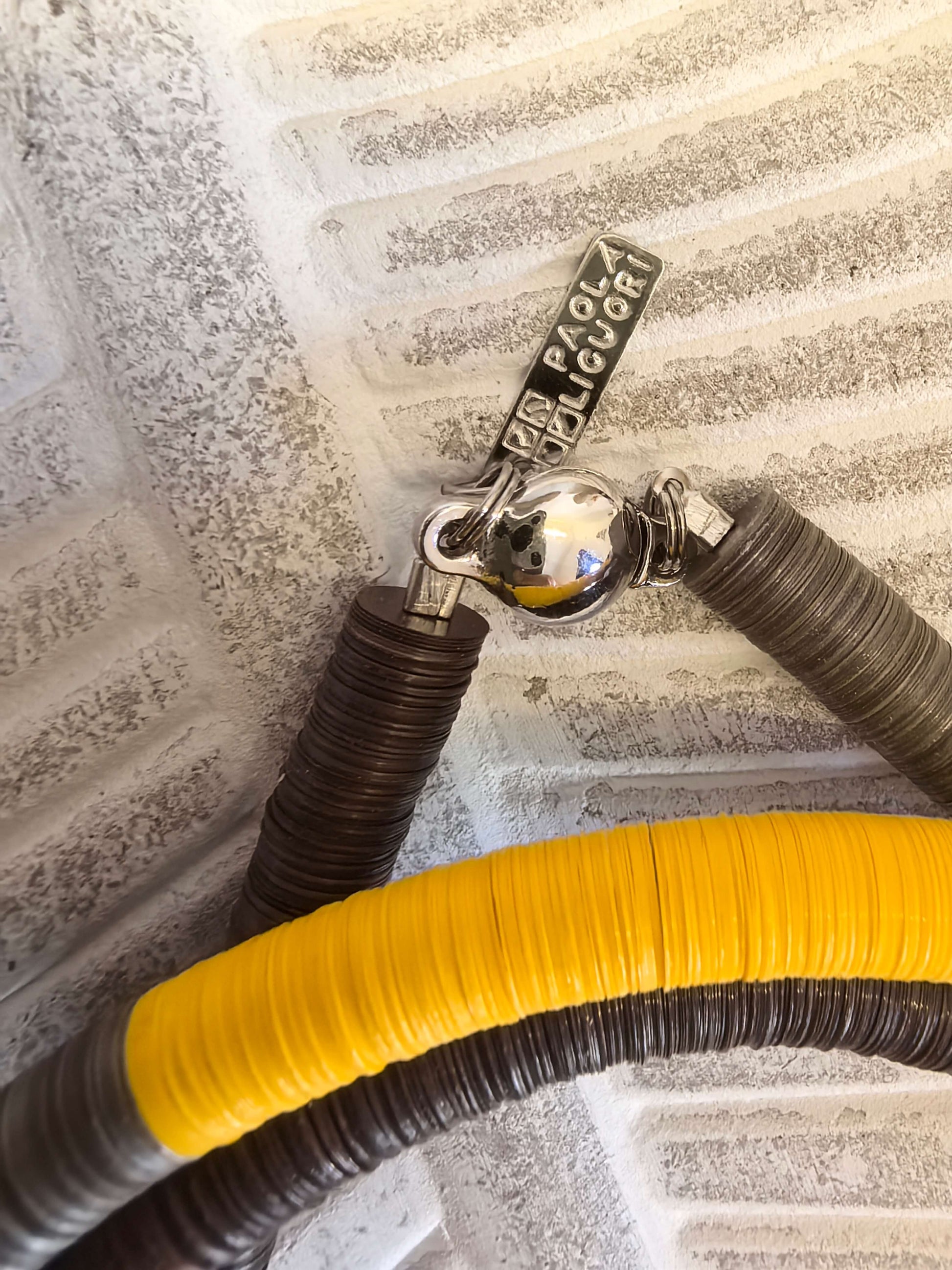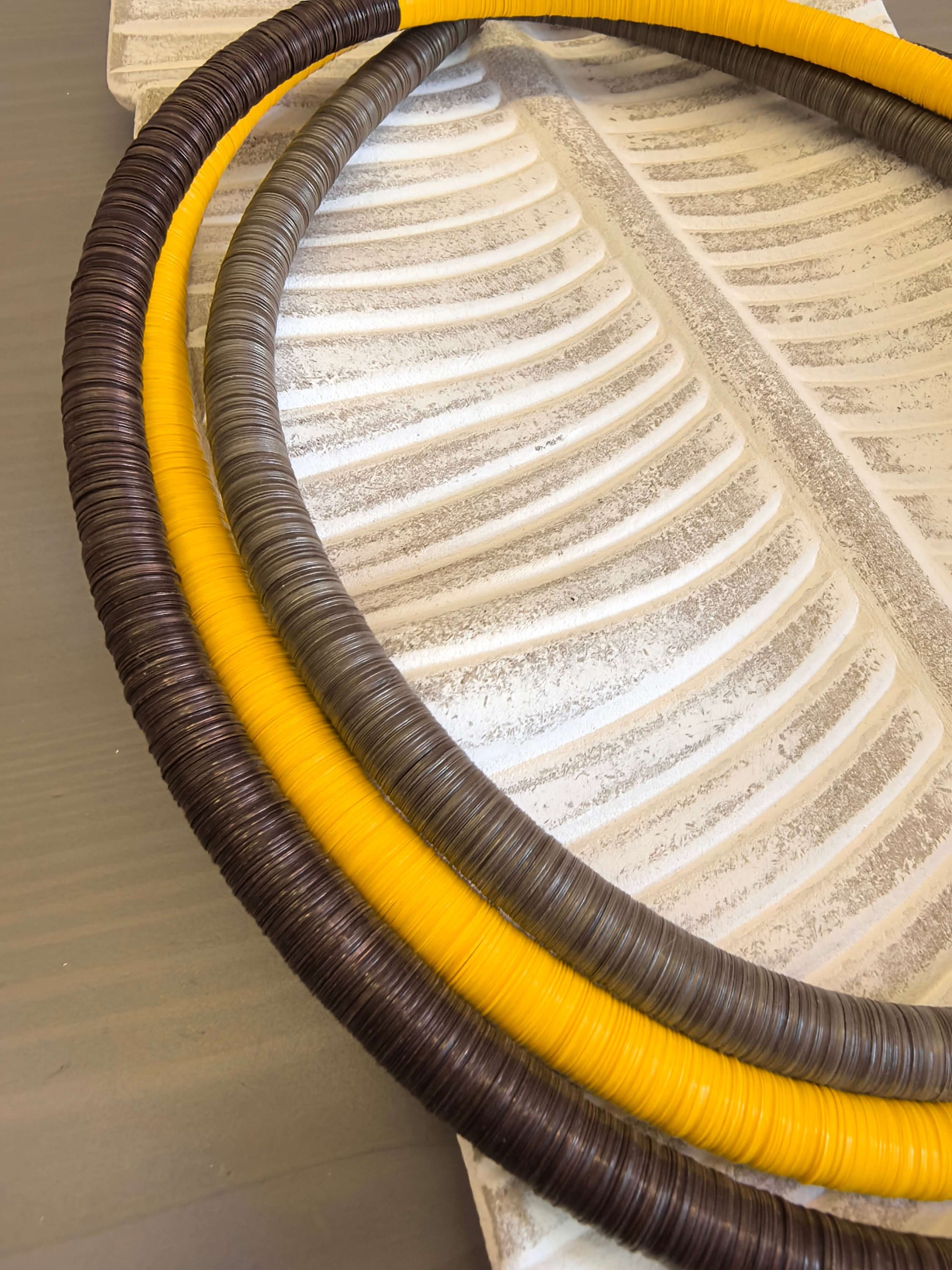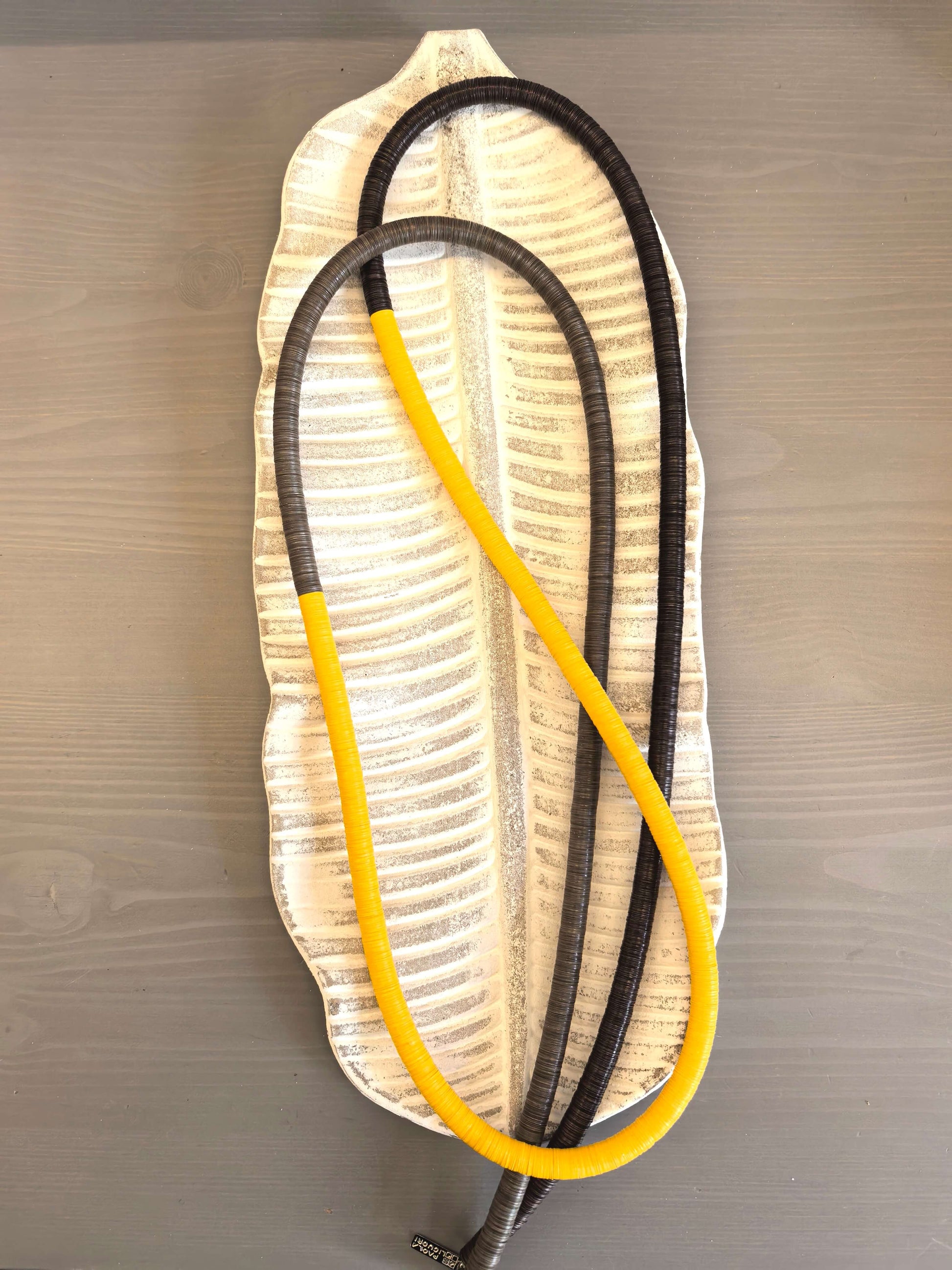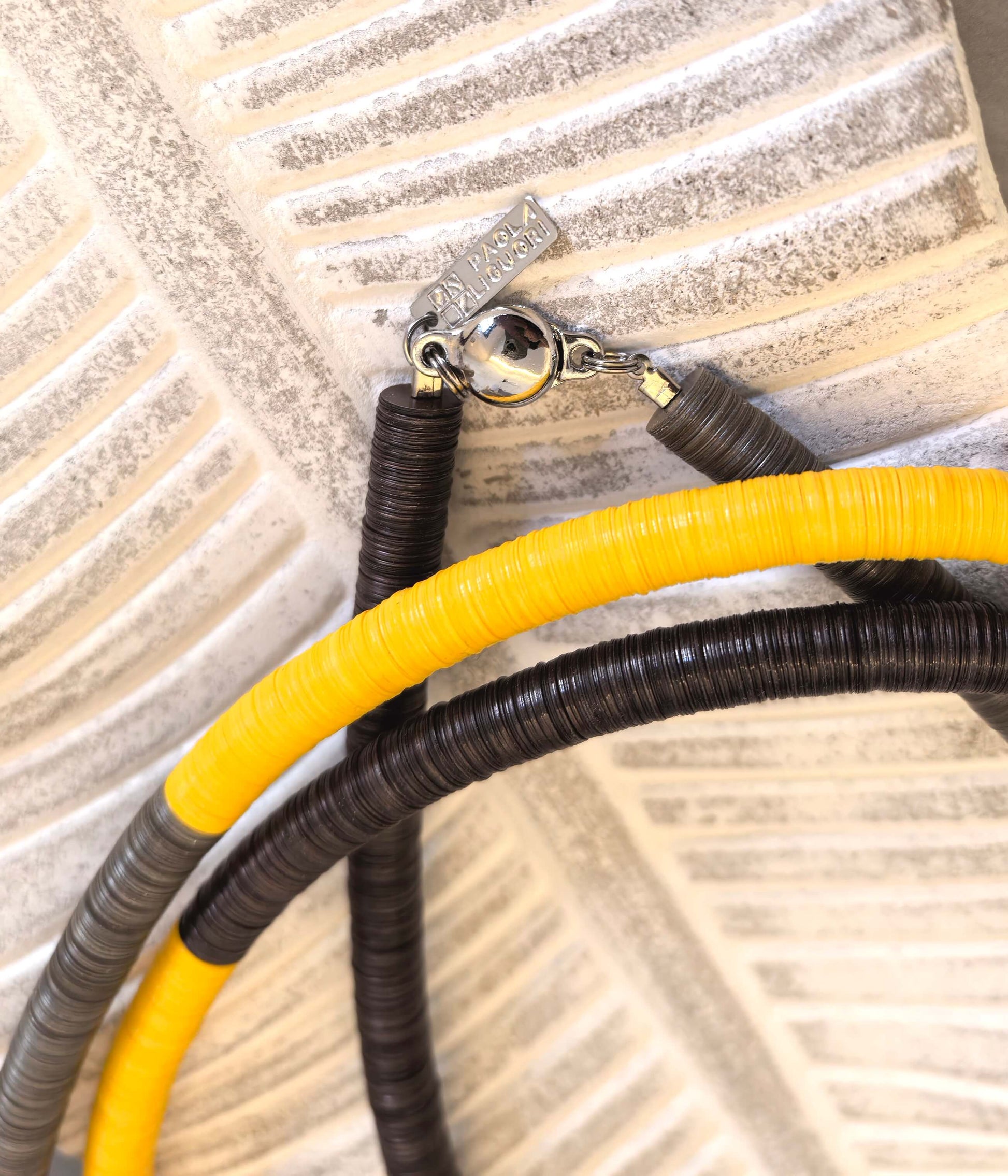 Peça feita com um fio único de 155cm nas cores marrom, amarelo e fendi.