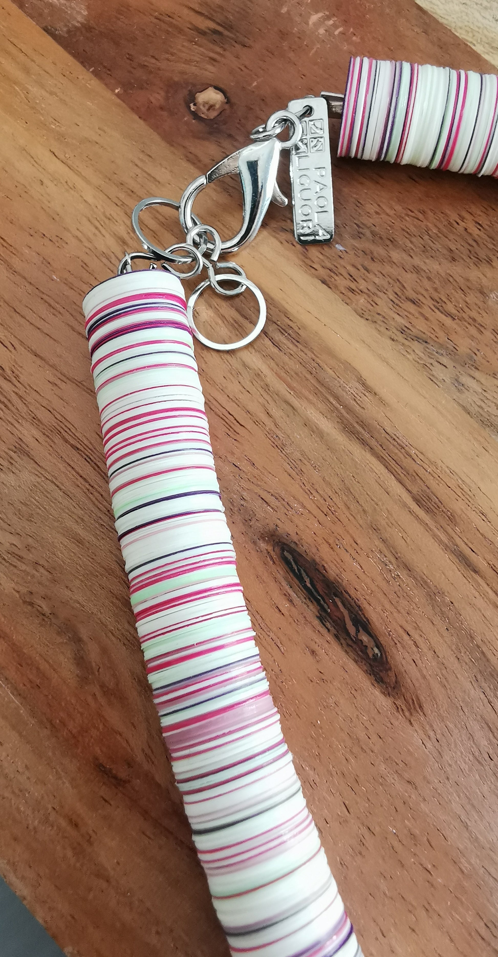 Cada colar é cuidadosamente feito à mão em Portugal, com contas de PVC de 12mm de diâmetro, fio de aço resistente e fecho tipo lagosta.