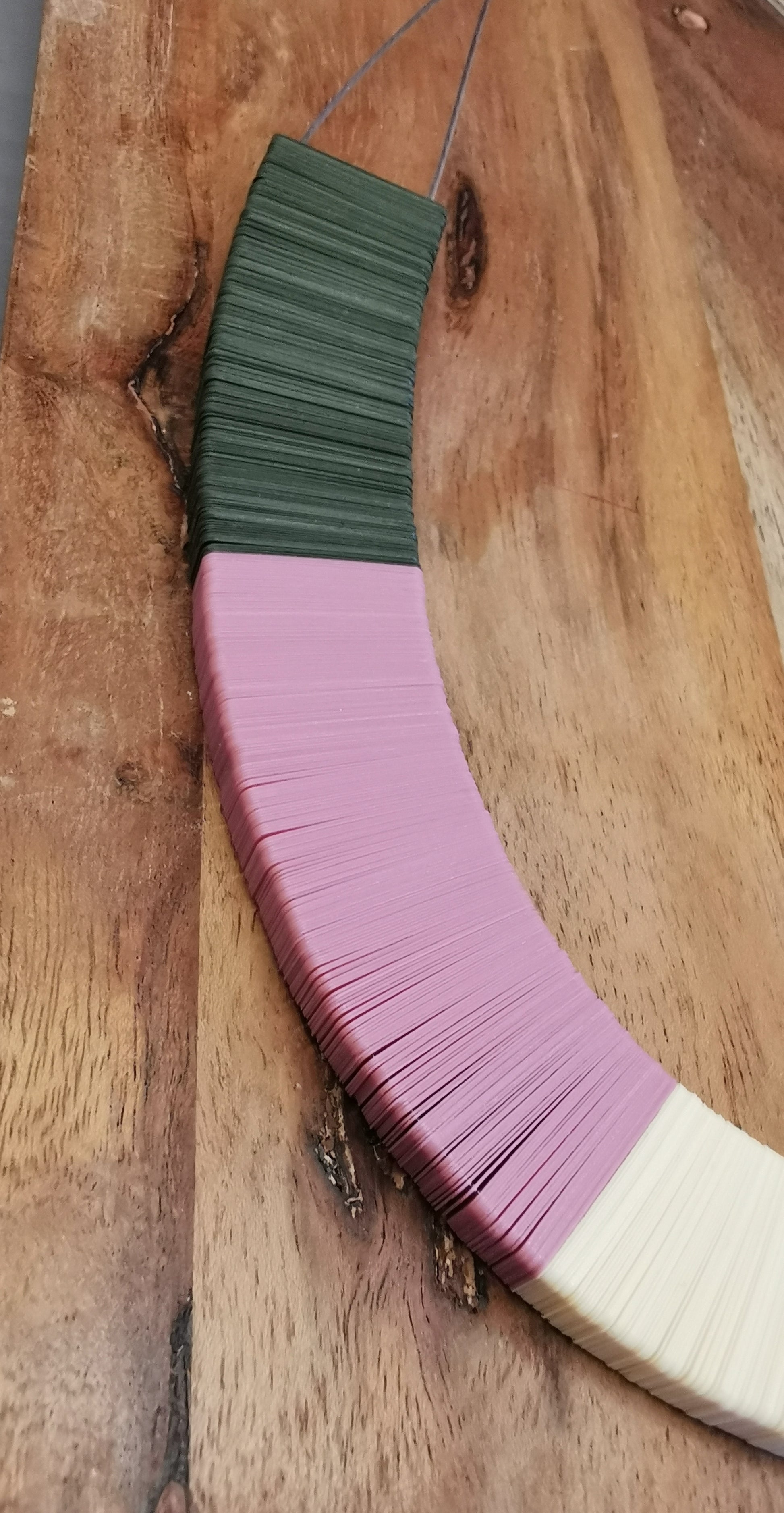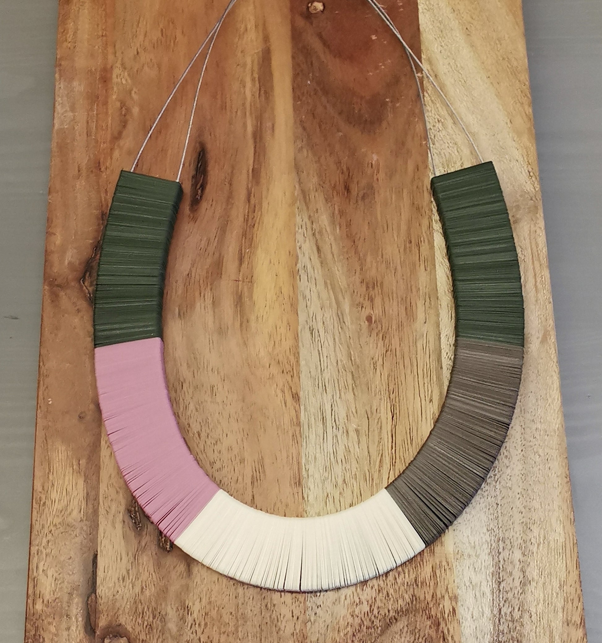 Com uma combinação de verde musgo, rosa claro, off-white e fendi , o colar Joana é uma peça para usar num look de trabalho ou num visual minimalista.