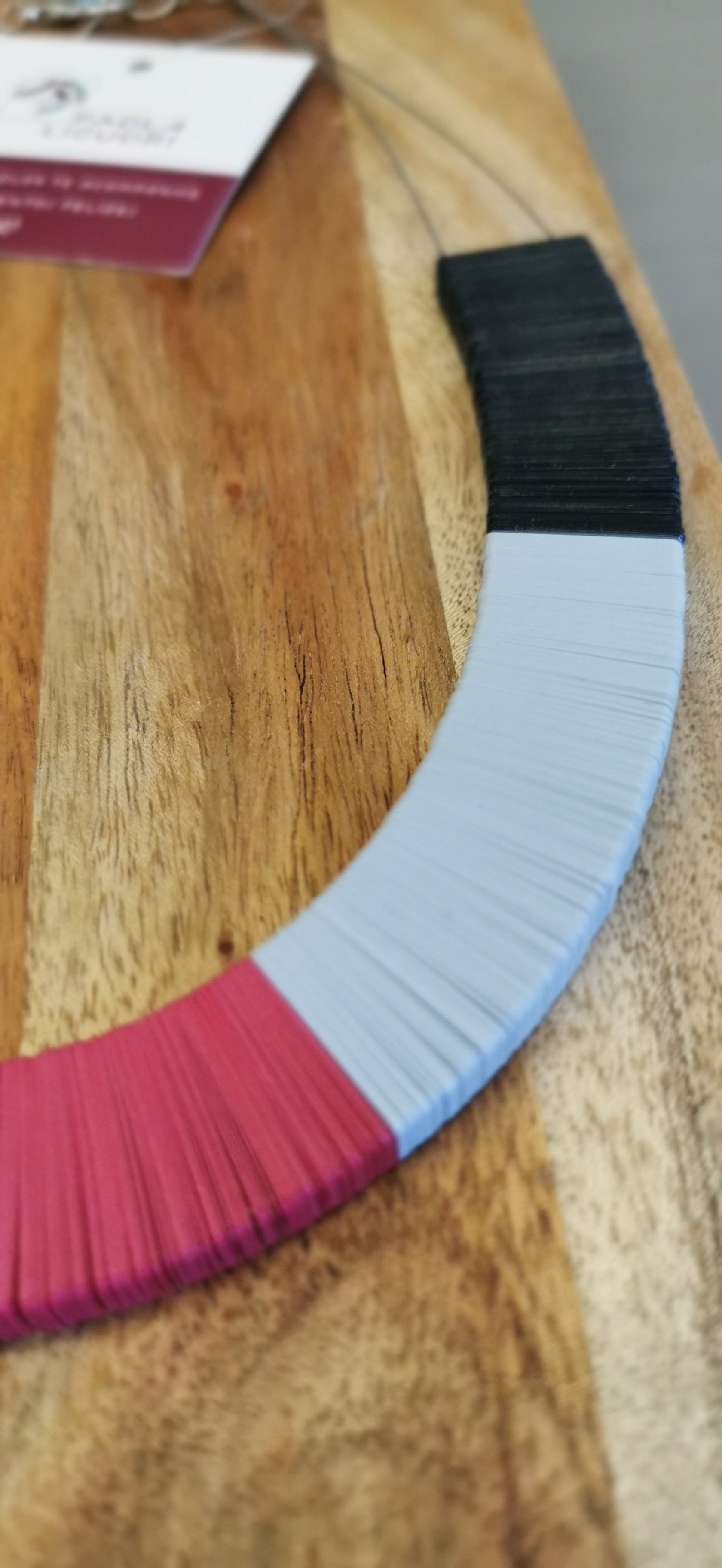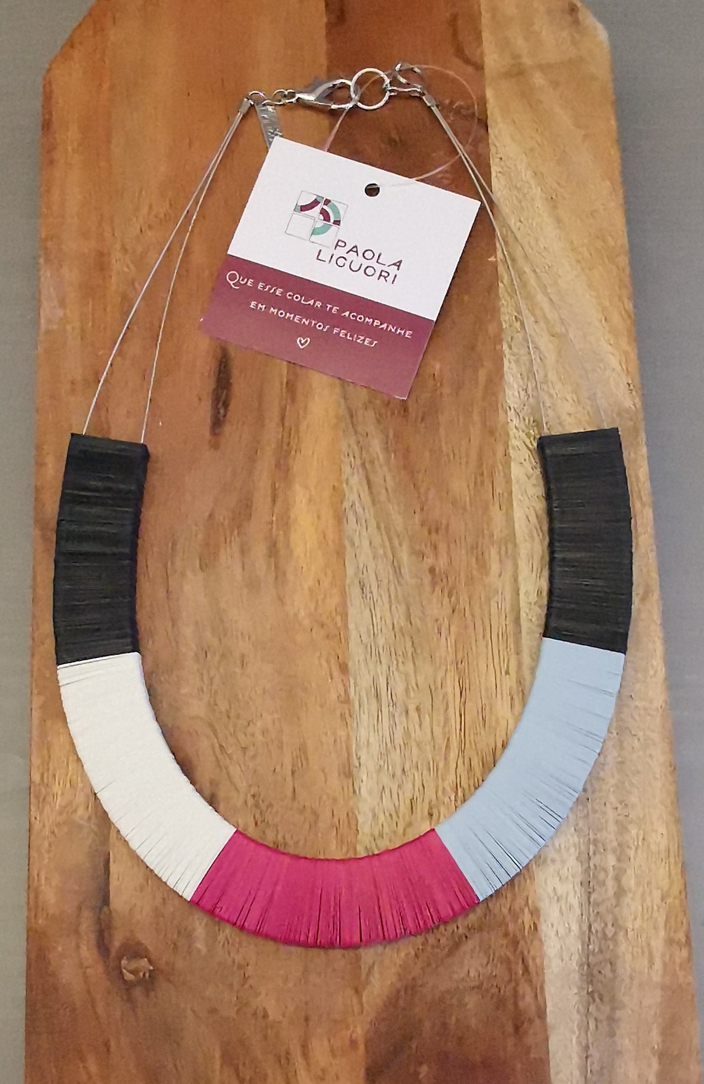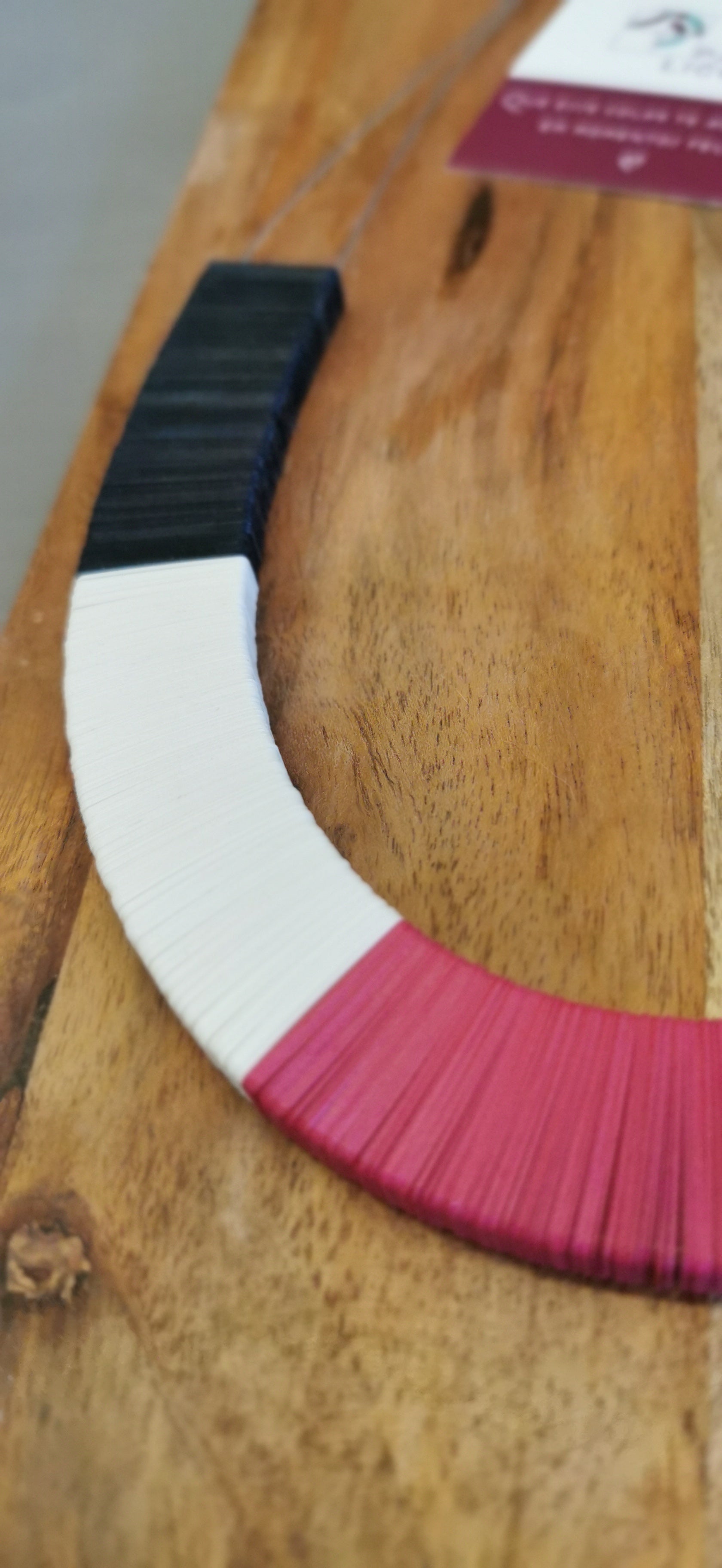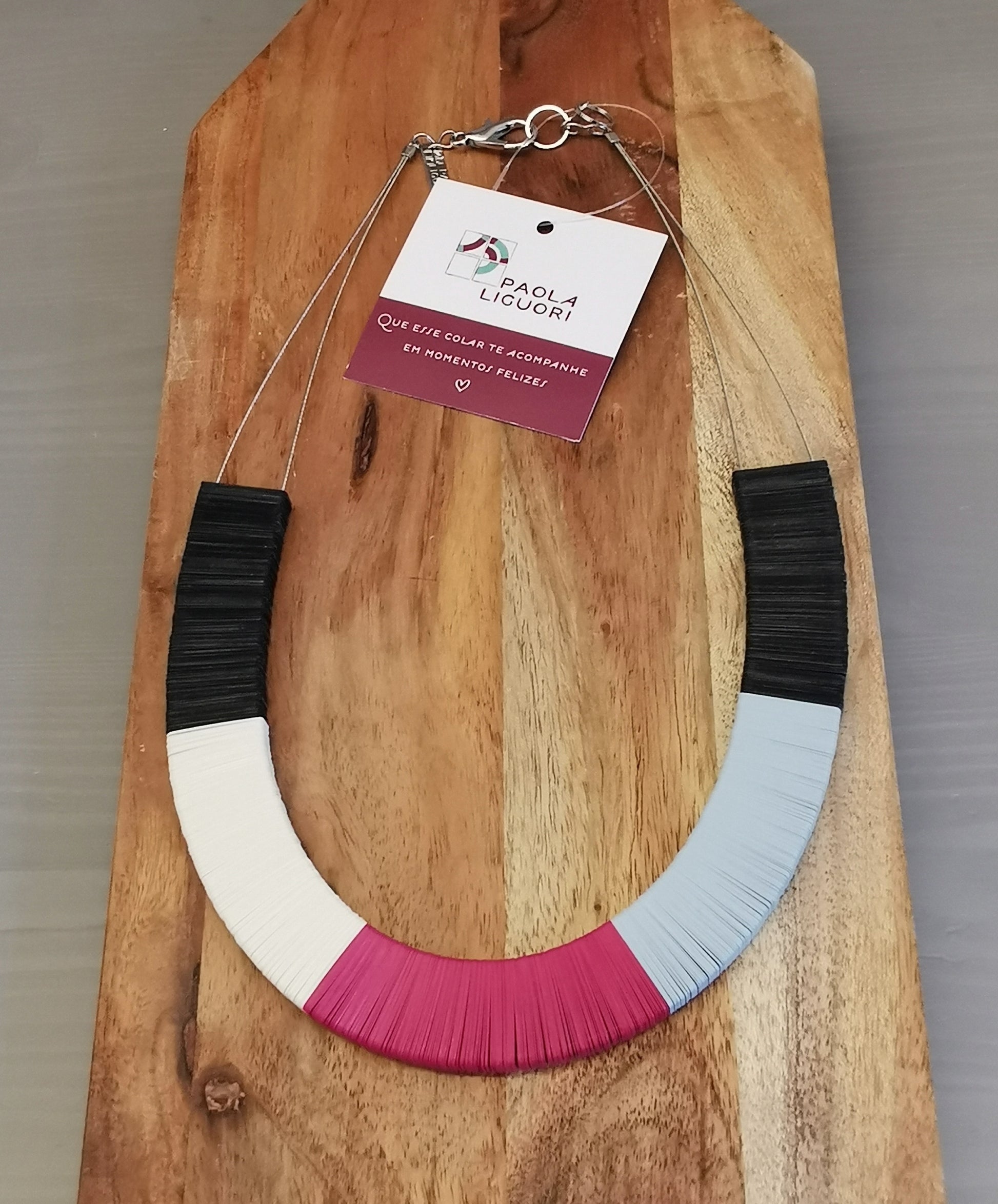Com uma combinação marinho, azul claro, pink e off-white, o colar Lara é uma peça contemporânea que equilibra contraste e harmonia. É uma peça para usar num look de trabalho ou num visual minimalista.