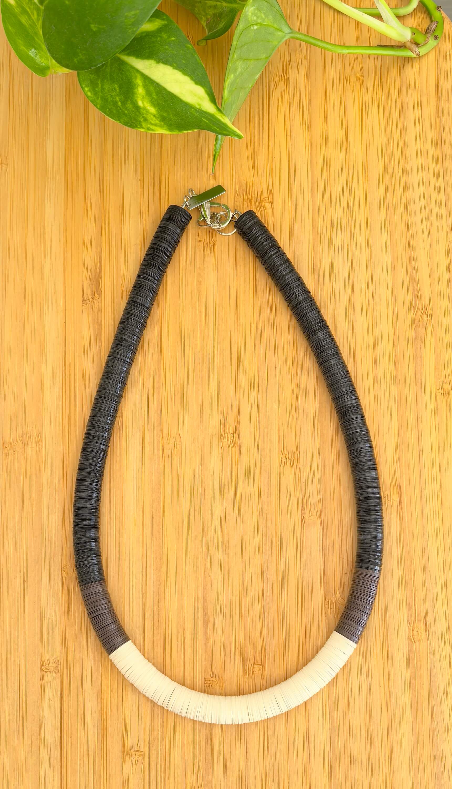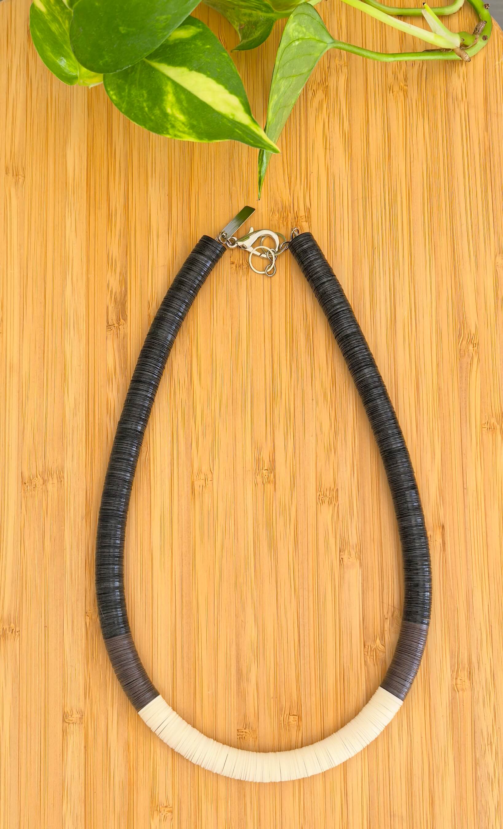 Este modelo traz a base em preto com um detalhe central em off-white e marrom, criando um contraste elegante que valoriza qualquer visual. A combinação de cores sóbrias e intemporais faz deste colar a escolha perfeita para quem procura um acessório versátil que transita facilmente entre o dia a dia e ocasiões especiais.