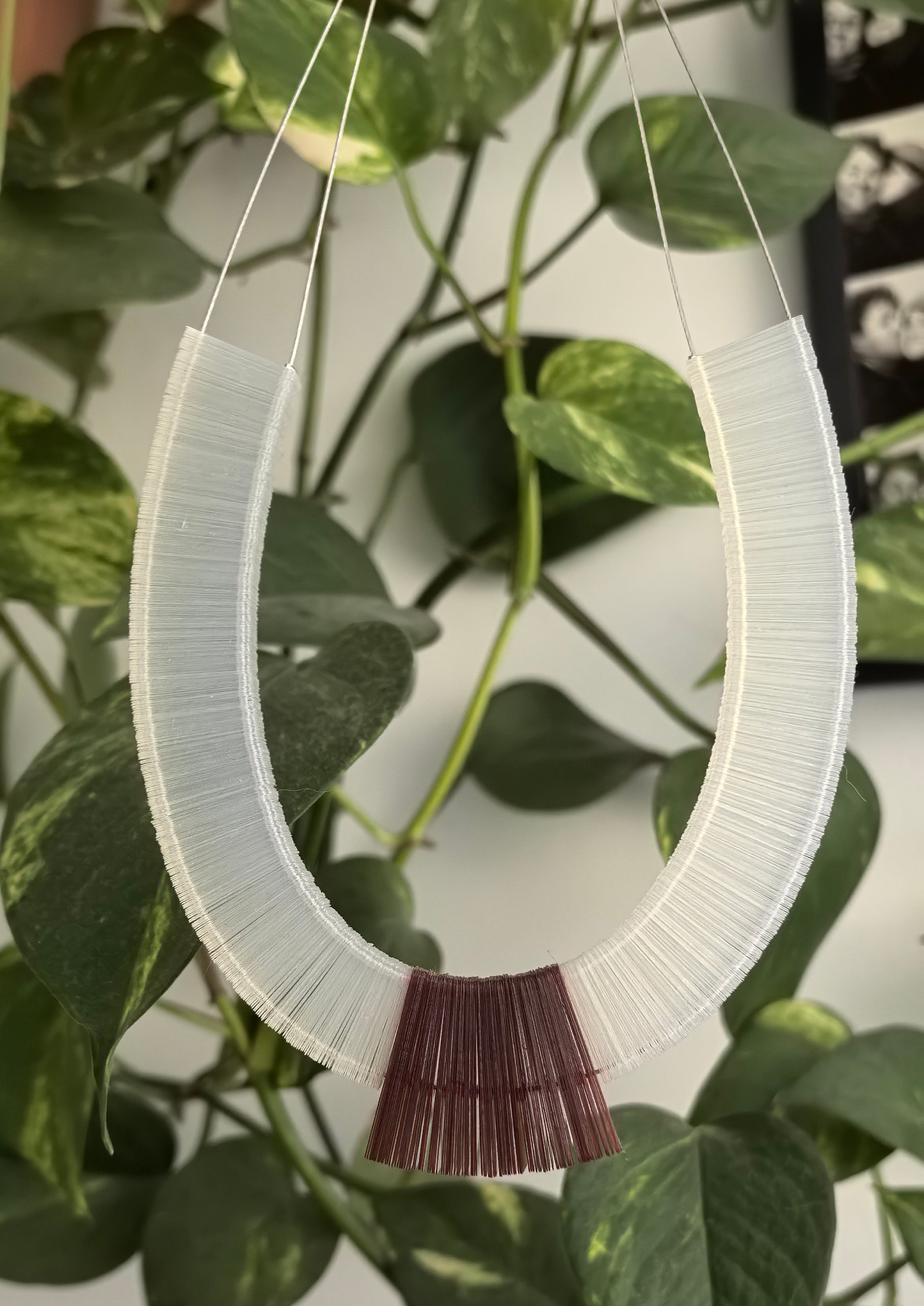 Um colar feito à mão com peças de pvc, fio de aço e um fecho de imã super prático.